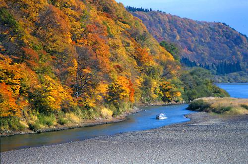 最上川は戸沢村で鮭川、角川と合流し、出羽三山の丘陵・山岳地帯に沿って庄内へと流れる。いくつかのカーブを描きながら、木々を背景に流れる様子は、四季折々の表情を見せ、川を下る舟とあいまって風情豊かだ。特に古口地区から清川地区までは、最上峡としてその美しさが知られている。
