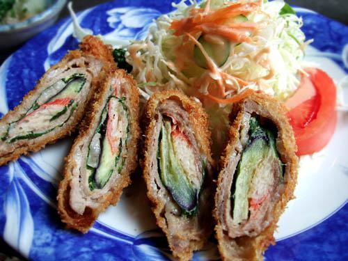 カニカマ、茄子、しその葉が豚肉でくるくる巻かれてて