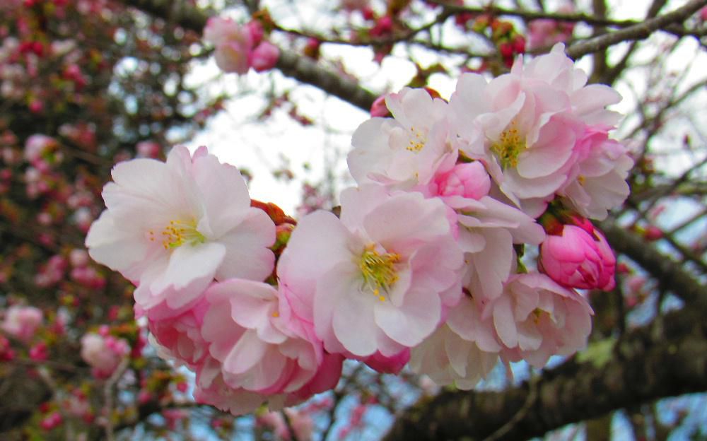 白鷹町のおそば屋の庭で珍しい桜の花と出会いました 八重の花びらでピンクの色をした桃の花のような桜です「ヤヱベニオオシマ(八重紅大島)」ではないかと思われます いたるところで桜が満開でまさに春爛漫といったところで昨日の風で散ってしまったのではと心配していますがもう少し桜の花を楽しめそうです
