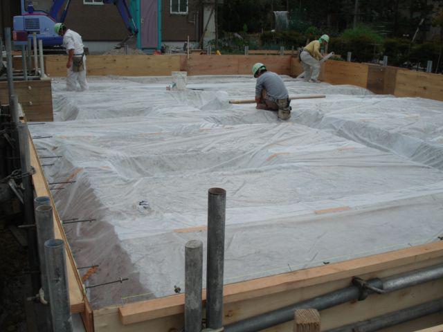 地盤からの水蒸気を防ぐための、防湿フィルムを敷き込んでいる所です。