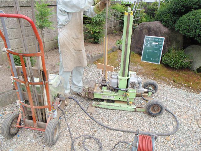 写真の細い鉄棒を一定の重さで沈めて 地耐力を調べます。
