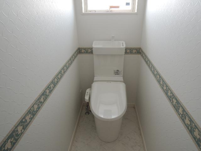 こちらは2階のトイレです。手洗いのついている『アラウーノV』が採用されております。大洗浄時は4.6L、小洗浄時はなんと3.0Lの水だけで洗浄してくれます。