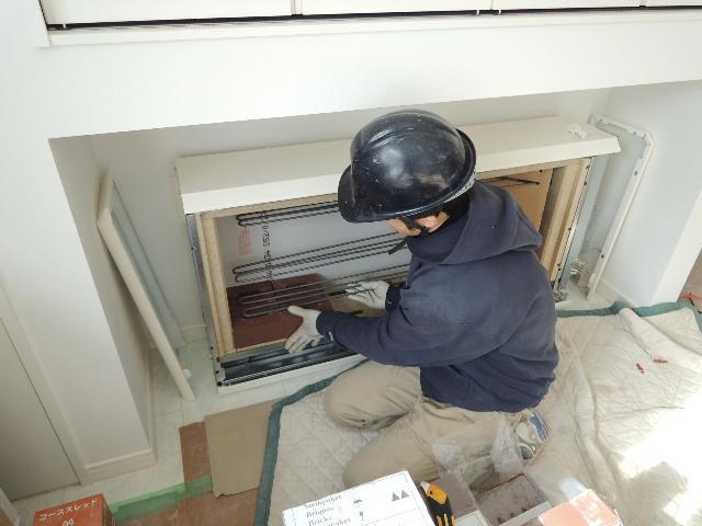 内部では蓄熱式暖房器の設置作業中です。