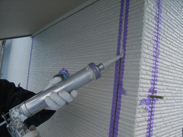 外壁のコーキング打ち込み中です。