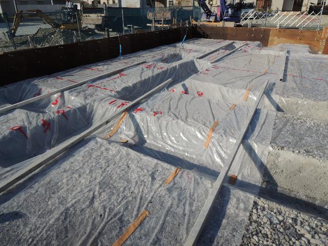 外周立上り型枠建て込み、及び土間シート敷きが終了し、鉄筋やさんの乗り込みを待つばかりです。