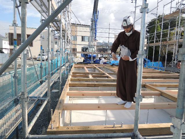 お酒、米、塩で建物四隅を清め、安全を祈願してから作業開始です。