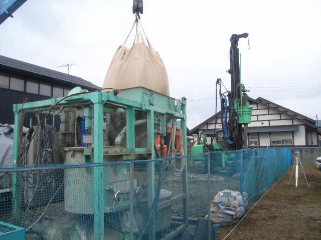 土を撹拌した後、セメント系固化材と水を混合した改良材を注入しながら杭を作っていきます。