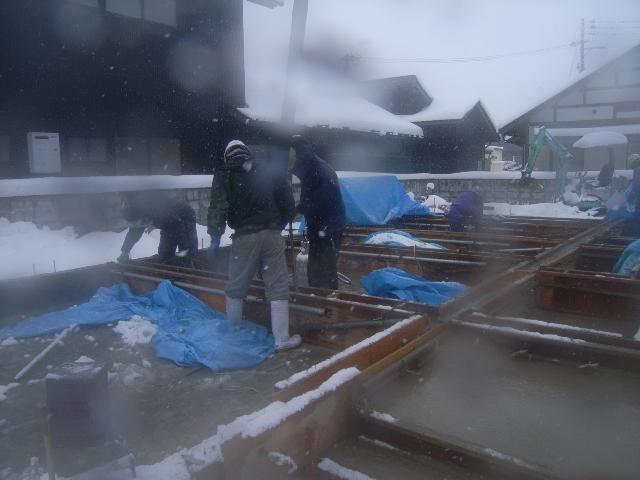 あいにくの空でしたが、雪を除雪しながら打設行いました。