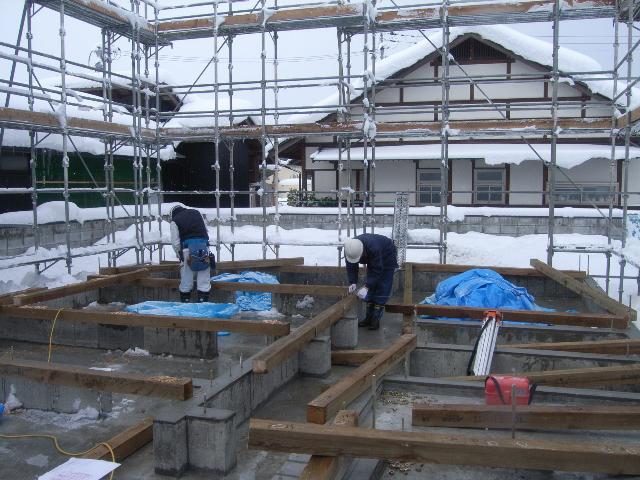 建物内の雪片付けが終わり、土台にアンカーボルトの位置をマーキングしております。