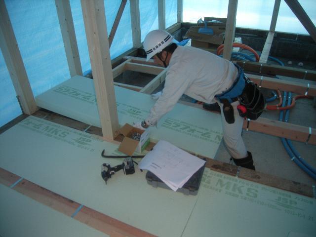 設備やさんの床下配管が終了し、床下の断熱材を入れております。