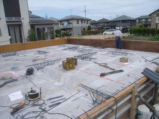 基礎の外周型枠建て込み・土間シート敷きも完了し、本日より鉄筋やさんが乗り込みです。