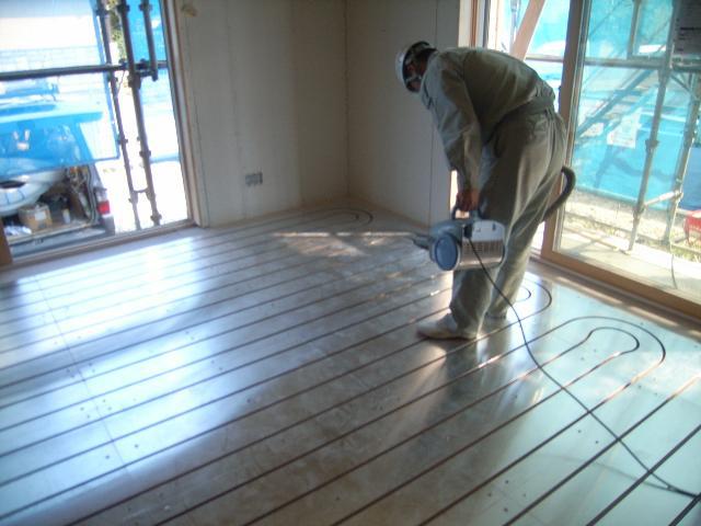 ヒートポンプ式の温水床暖房システムのパネル敷き込みです。
