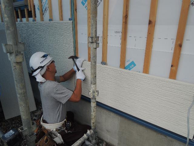 当社の標準仕様の外壁はケイミュー鰍フ雨で汚れを浮かせて流す『親水セラ』16oです。『金具留め工法』のため、専用金具で1枚ずつ留めていきます。