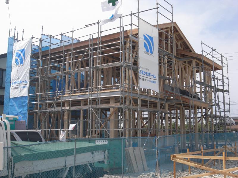 クレーンによる建て方工事も無事終了し、筋交い入れ・1階の床合板敷きの工事を行っております。
