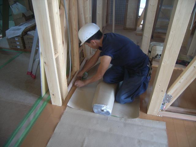 貼り終わった部分は、傷がつかない様に速やかに養生を行っております。