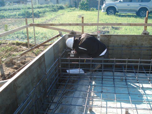 基礎コンクリート打設前の内部配筋の鉄筋寸法や施工状況を検査しています。