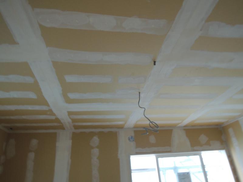石膏ボードのジョイント部分、ビス部分をパテで平らにしていきます。