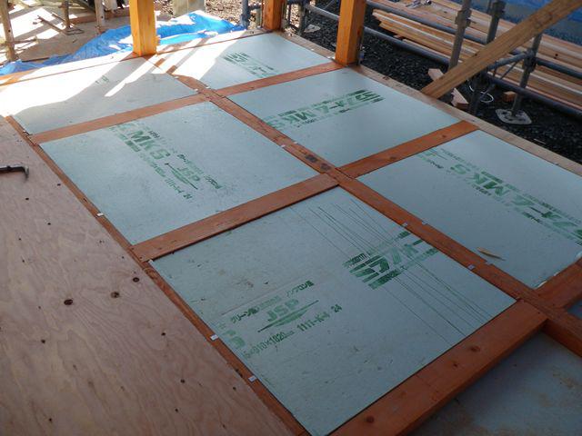 防蟻処理をした大引きの間に 『厚さ95o』!の断熱材を取付け、そのうえに床下地の構造用合板 『厚さ28o』!を敷いていきます。