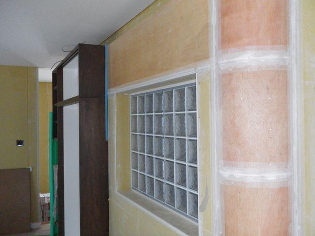 壁の下地処理(パテ処理)が進んでおります。ガラスブロックの奥はお風呂場です。