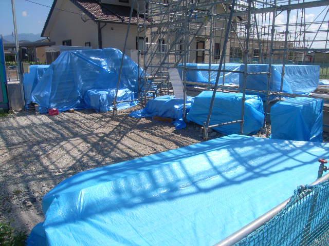 搬入されたテクノストラクチャー材・及び木材関係は、このようにしっかり養生しております!