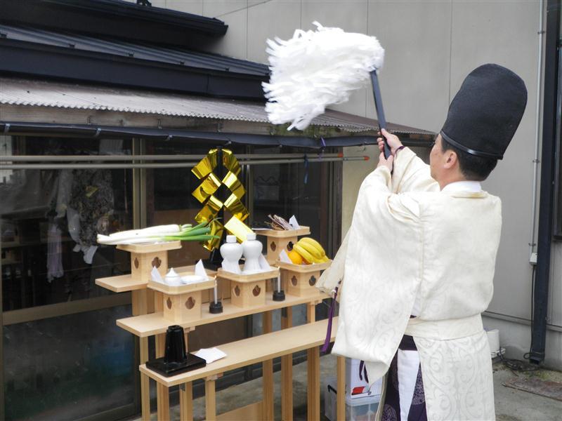 解体する既存部分を前に宮司様にい祓いしていただきました。