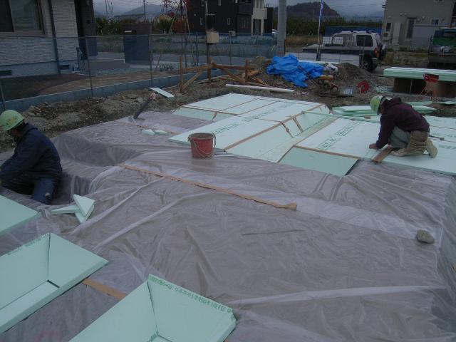 当現場は、基礎耐圧盤にスラブヒーターを布設する工法の為、熱が下に逃げないように断熱材30mmを耐圧盤の下に敷き込みます。