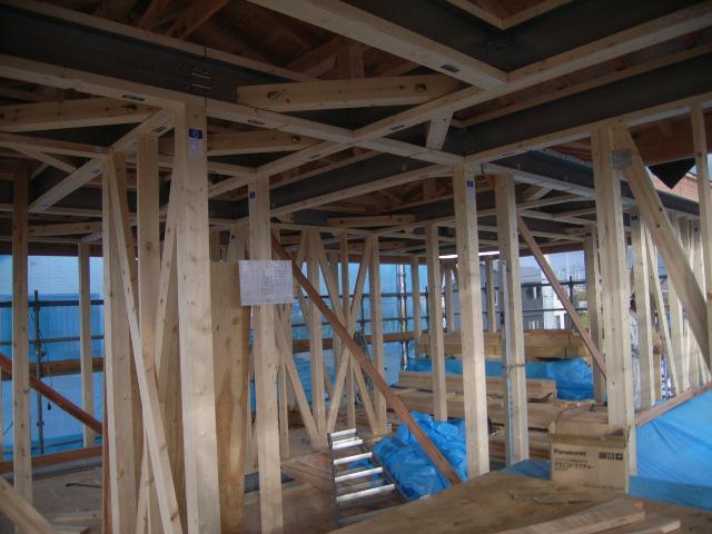 小屋組みの火打ち梁入れ・2階の筋交い入れをおこなっております。