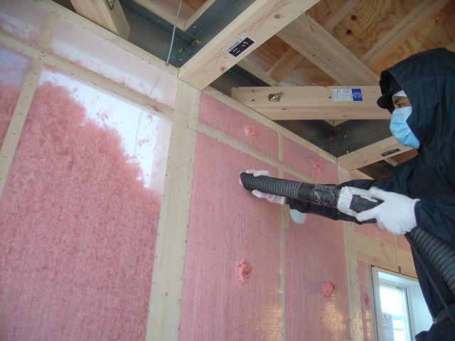 ▼東根市Mの樹団地 TS様邸新築工事-25 壁断熱グラスウール吹き込み 『テクノストラクチャーで建てる山形の長期優良住宅』