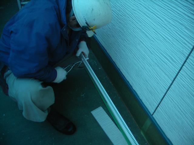 バルコニーの外壁貼りです。まずは軒天取合い部分に取付ける通気金物取付です。