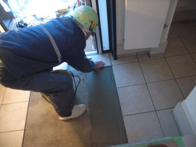 玄関のタイル貼りの状況です。300角の床タイルを使用して1枚1枚丁寧に貼っております。