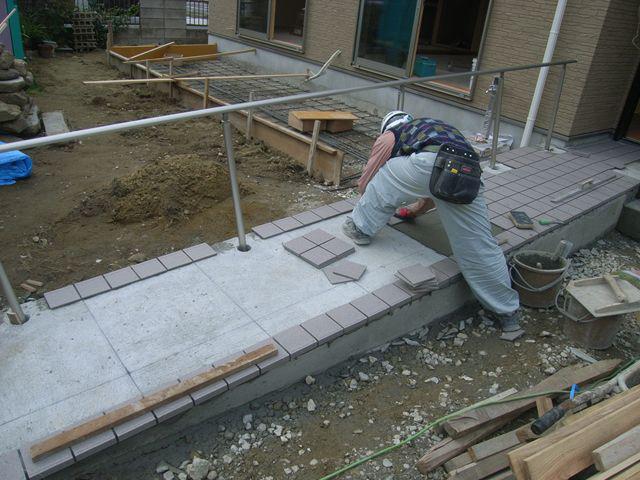 タイル屋さんがスロープの床タイルを貼っています。