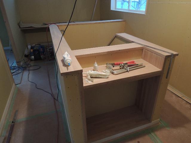 当現場では笠木に合わせてタモの積層材を使用して棚を作成しております。