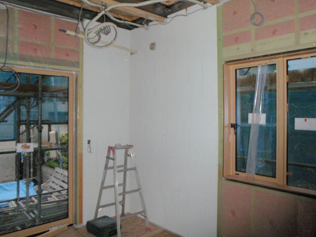 昨日1階の断熱材を充填した一部の構造壁に 構造用ボードを貼りました。