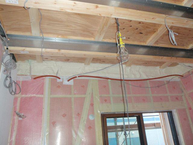 断熱工事も終盤に差しかかり 梁内側に『現場発泡ウレタン』を吹付けました。