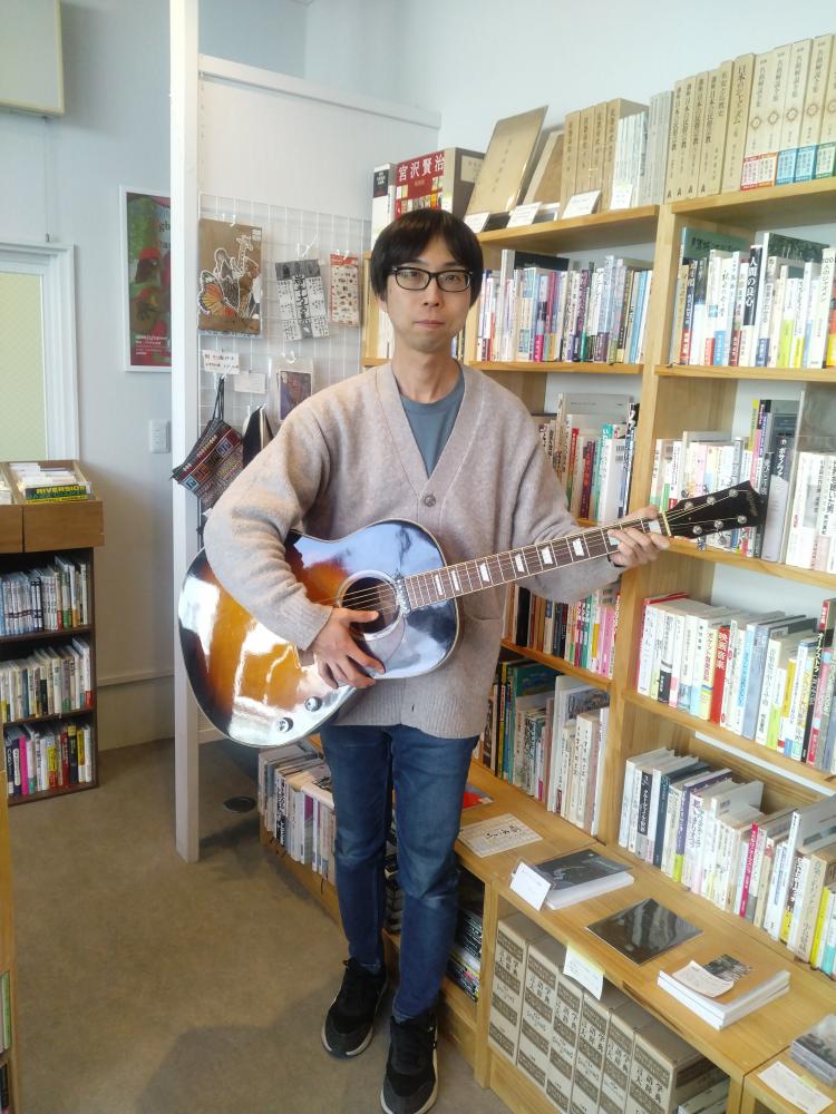 (写真はギターを手に“本談義”に興じる村上さん=花巻市大通り1丁目で)