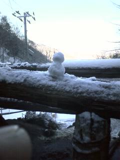 朝、清掃に 露天風呂にいったら、この作品が 無造作に 置いてありました。私は一目見て すごい方の作品だと思いました。凛とした眼光が 下界を見下ろし 輪郭の取り方といい 中々のものと 私は見ました。これは 21世紀の最大の雪だるまの 作品です。(自称 雪だるま評論家)何とか保存して多くの方々に 見て頂こうと 思っていたら 頭上に天敵 お日様が現れて