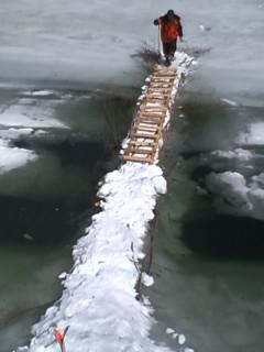 本日をもって 今シーズンの水窪ダムのわかさぎ釣りは終了しました。ごらんのように、氷上への 怖い桟橋でした。魚協では、昨日の夕方に釣り禁止の看板が掲げてあり 我々は 途中に置いてある道具の回収に。桟橋も危険で 氷もシャーベット状で危険です。