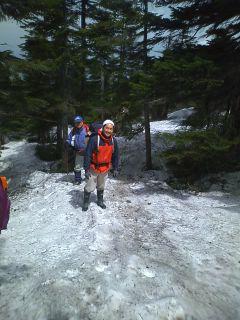 またまだ 残雪が 登山道を覆い 道迷いの発生が心配される場所にロープを張ったり木の枝に赤布の切れ端を付けたりしています。中央の スタッフは白布温泉 中屋不動閣の セガーレです。