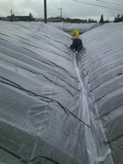 これは、さくらんぼ園のビニールハウスの屋根の上です。今日は上村農園にきています。さくらんぼ園の開店準備の 手伝いを行っています。地上より5mぐらい上で ビニールの屋根の部分を ビニールひもで 固定する作業をしました。中々スリル満点の作業です。さくらんぼ園の開店は 6月19日(土)からです。例年より 1週間ぐらいおくれているとの事。