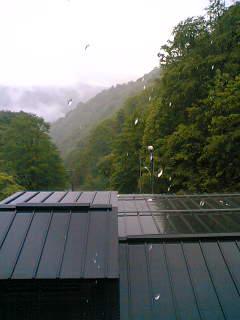 ▼山の宿も 一日雨かな。