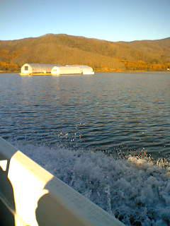 湖面に のんびりと浮かぶ わかさぎ釣りの屋形船です。