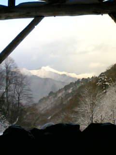 雪に覆われた兜山が 灰色の空をバックに 見えます。すべてが 墨絵のようてす。美しくそして物悲しそうな 風景です。
