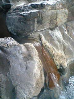 源泉よりパイプでここまできて 露天風呂に温泉が注ぎます。中々雰囲気がでていますよね。周りの岩も長年温泉成分で変色してます。これがまた一層温泉をひきたたせています。のんびり ゆったりとしてください。
