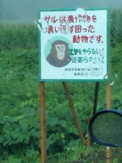 米沢市内より白布温泉へ向かう県道2号線の南原地区内に たっております。全国的に 問題になっている 猿による農作物への被害が 深刻になっております。雨の中 車の室内よりの撮影で多少見苦しくてすいません。農家の人達が 丹精こめて作ったものを 横取りしていきます。この日も この看板の30メートル先で 雨の中 猿が とうもろこしを 食べていました。車のクラクションを鳴らしても 逃げません。困ったまのです。くれぐれも 観光などで お越しの節 道端で 猿を見かけても 絶対に エサなどは与えないでください。「困っている猿を見かけても 先に困ってる人を助けてください」
