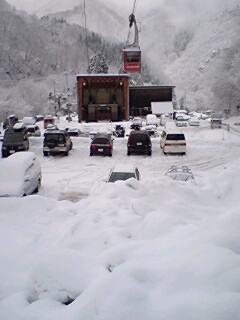 スキーヤーで賑わう 天元台スキー場の 玄関口の湯元駅の風景です。前日からの雨は ゲレンデは 雪が降り本日のコンディションは 最高です。