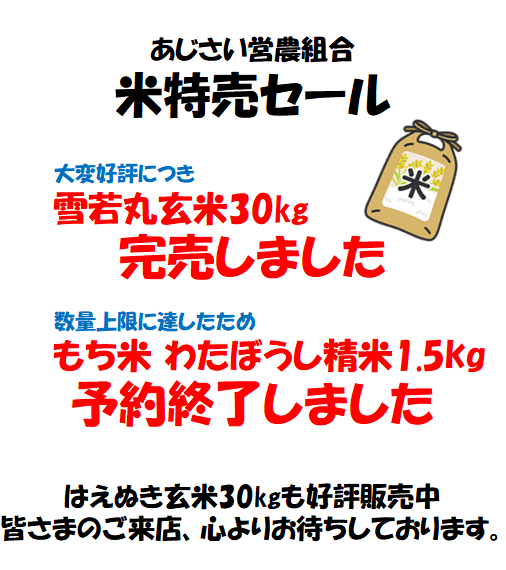 残念なお知らせです・・・。大好評につき雪若丸玄米30㎏、完売いたしました。また、もち米わたぼうし精米1.5㎏も数量上限に達したため、予約終了となりました。これからお買い求め予定だった皆さま、ご希望に添えず申し訳ございません。