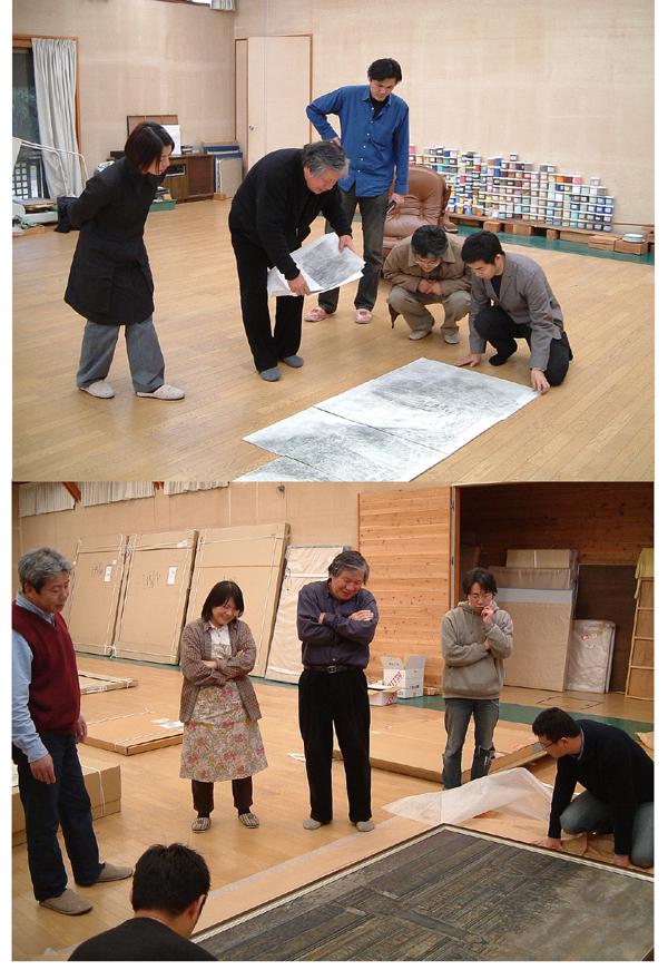 また、この日は芸工大の日本画研究室の方々が応援に駆けつけてくださり、倉庫から作品を出して梱包を解き、痛んでいる箇所には修復を施して再梱包・積み込みと、3時間程の作業に力を貸していただきました。