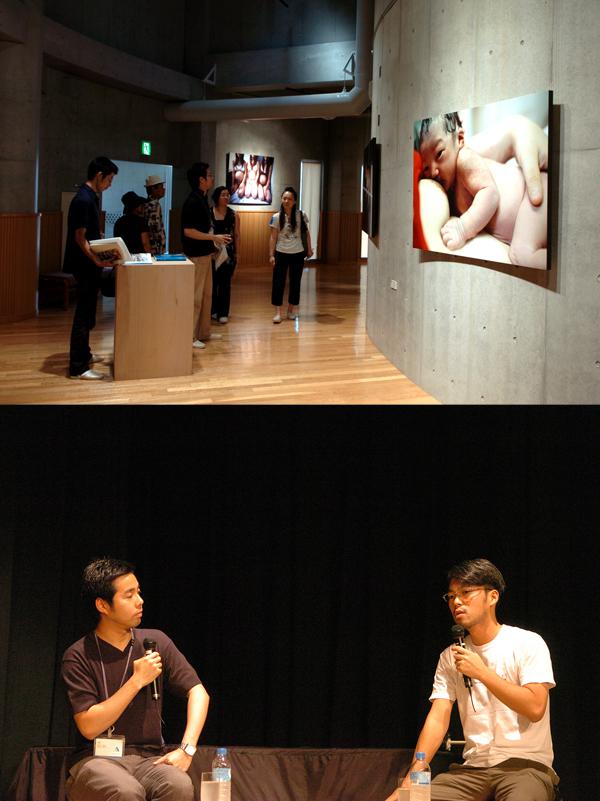 トーク会場となったこども劇場の周囲には、一週間前から『いま』の写真の中から20点ほどが、大橋さん自身の手による構成で展示されていました。その中で、劇場の入口に掲げられた大延ばしのプリントが、出産シーンを真正面からとらえたショッキングな写真であったために、事務局の中には、こども芸大に通学する児童や保護者の反応を懸念する声もありました。こども劇場は、胎内とイメージした球形をしています。その入口(出口)に出産シーンの写真を高々と掲げるのが、大橋さんの意図するところだったのですが。