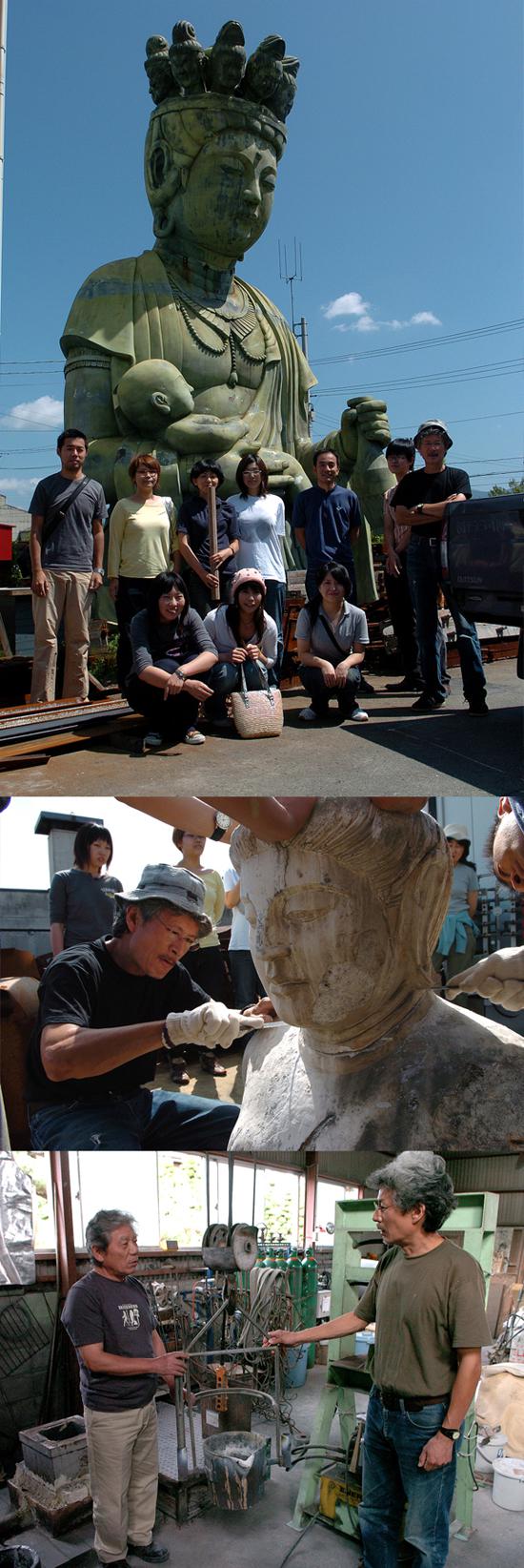 ■写真上:旅のはじめの記念写真。『鈴木鋳造所』さんは仏像や梵鐘を扱う大きな鋳造所。