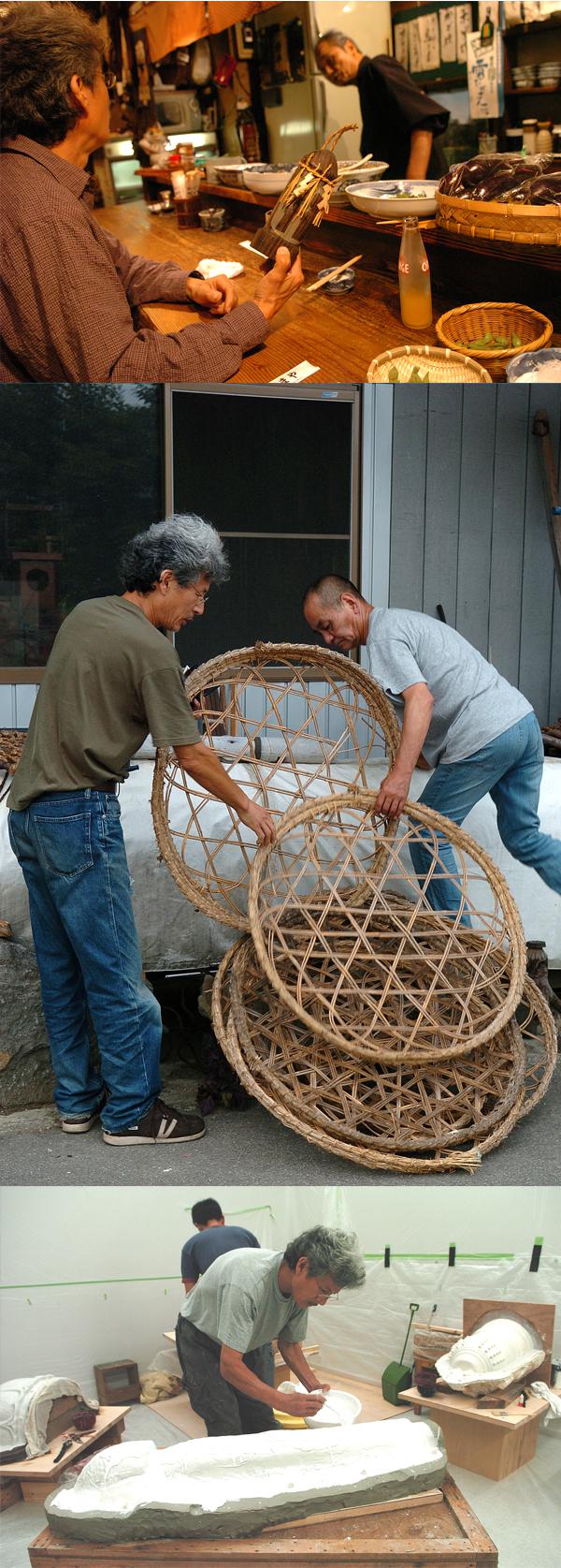 ■写真中:上山の古道具屋で養蚕用の藁籠を7枚入手。これは展示会場造作の一部として使用する予定。